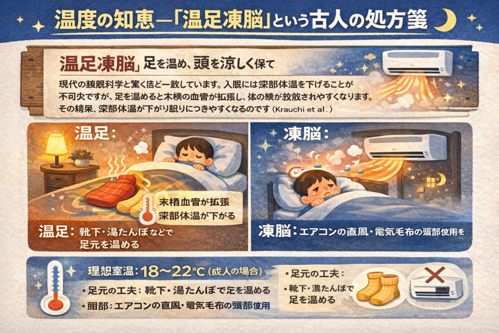 現代の睡眠科学と驚くほど一致しています。入眠には深部体温を下げることが不可欠ですが、足を温めると末梢の血管が拡張し、体の熱が放散されやすくなります。その結果、深部体温が下がり眠りにつきやすくなるのです(Krauchi et al.)。