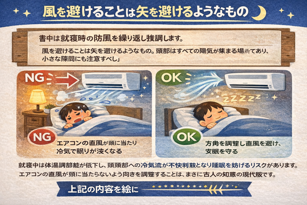 現代的に解釈すると、睡眠中は体温調節能が低下するため、頭頸部への冷気流が不快刺激となり睡眠の断片化を引き起こすリスクがあります。エアコンの直風が頭に当たらないよう向きを調整することは、まさに古人の知恵の現代版です。